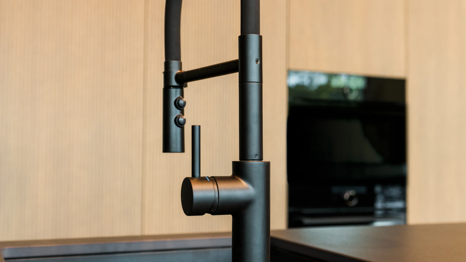Japandi keuken met zwarte glaskasten