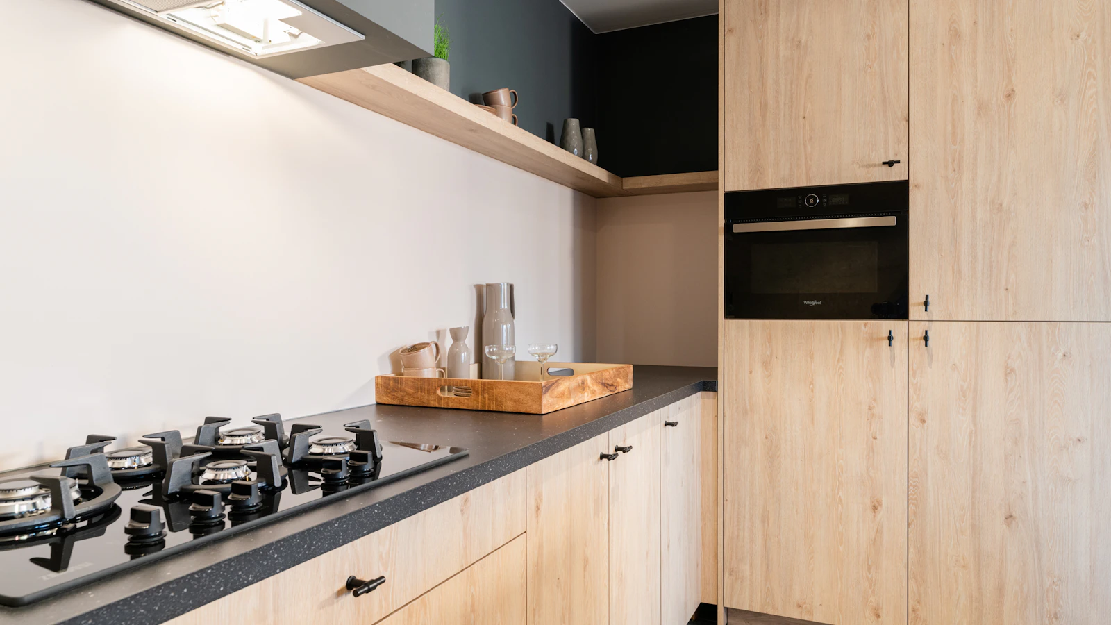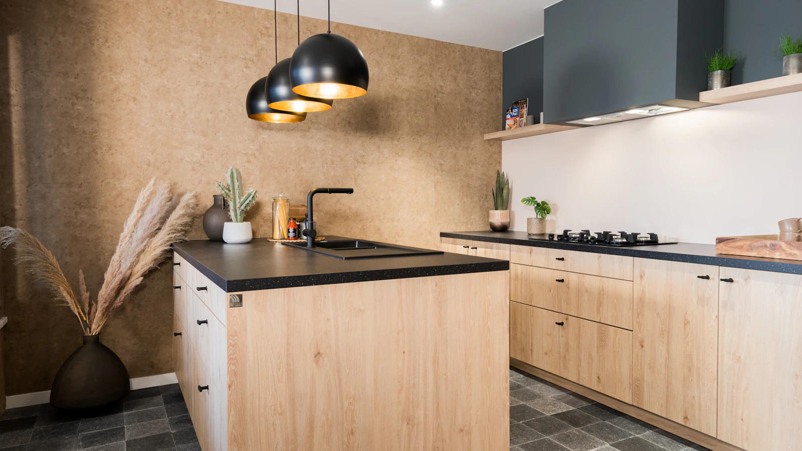 Landelijke moderne keuken met zwart laminaten blad