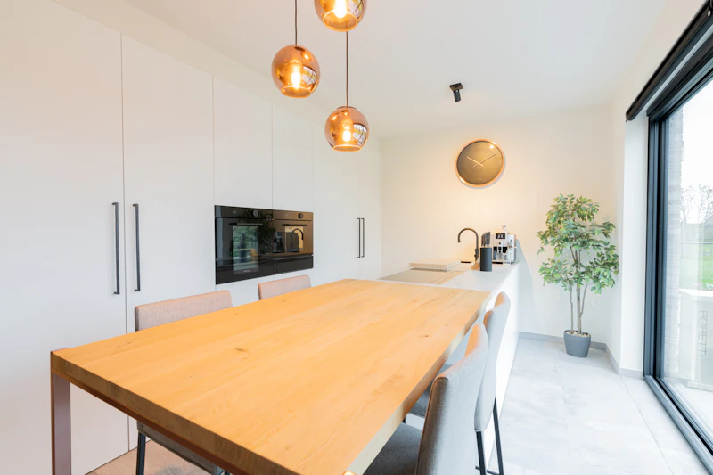 Ongelooflijk maar waar: op enkele meters staat nu een volledig ingerichte keuken met een geïntegreerde eetplaats en een verborgen deur in de kastenwand van de keuken. De creatieve opbergoplossingen en de stijlvolle afwerking maken de keuken helemaal af.