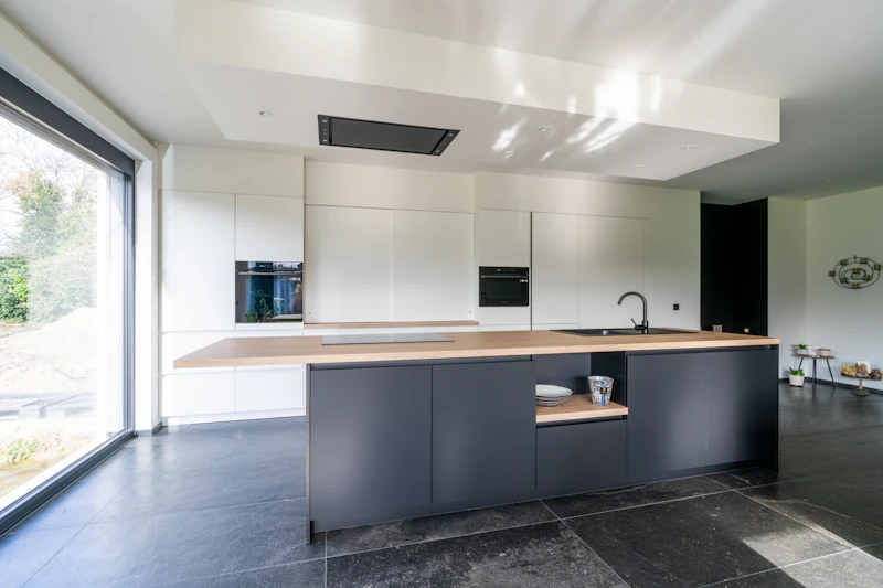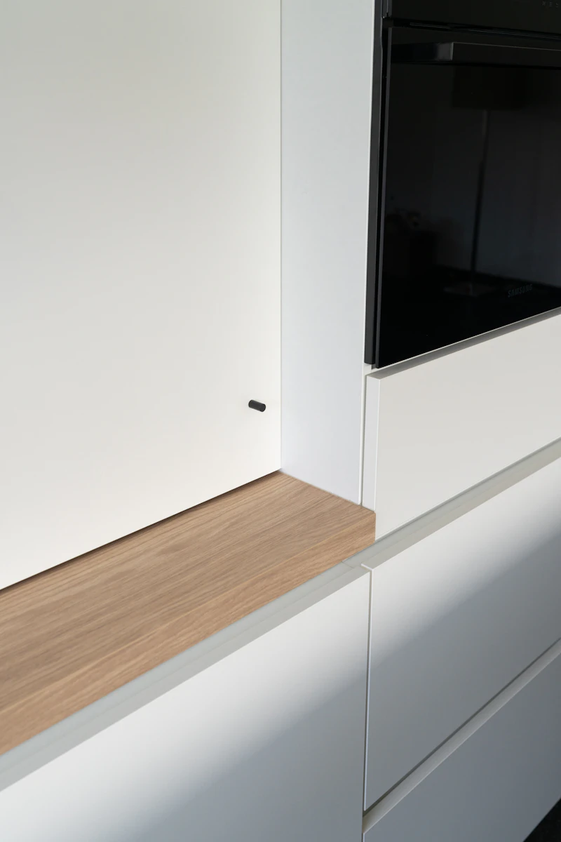 De familie Buytaert koos voor een zwart-witte en moderne keuken met slimme toestellen, innovatieve opbergoplossingen en een stevig keukenwerkblad. Het laminaat werkblad in Urban Wild Oak is maar liefst 4 cm dik, hygiënisch, functioneel en relatief snij- en krasvast. De strakke zwart-wit combinatie maakt deze keuken tijdloos voor de liefhebber van de luxueuze designuitstraling. Je persoonlijke interieurarchitect helpt jou bij het ontwerpen van de juiste sfeer en laat die naadloos aansluiten op je volledige interieur.