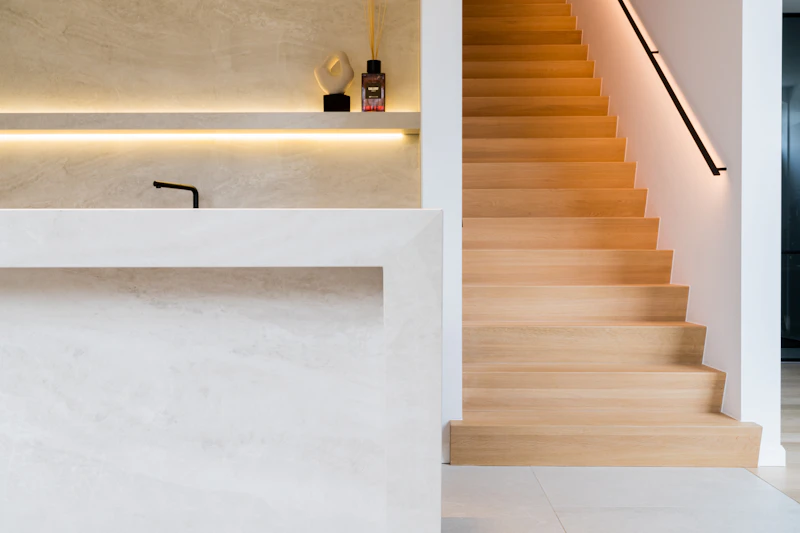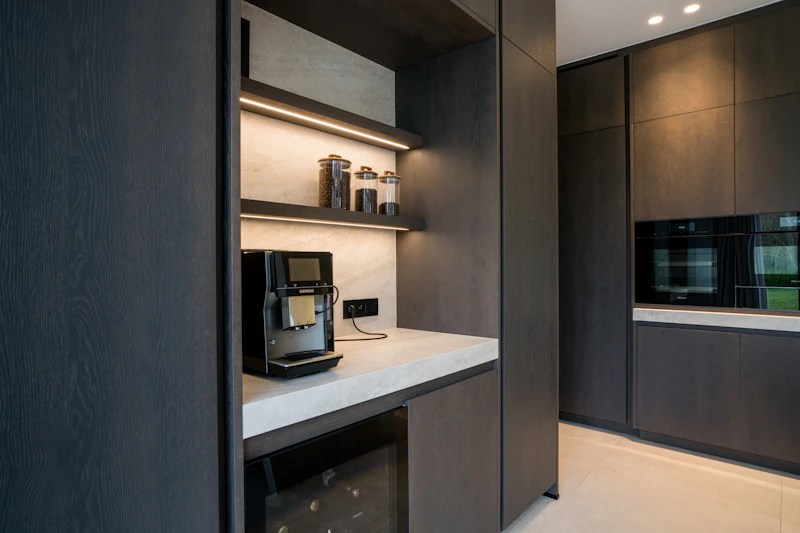 Familie De Vos stapte binnen bij Keukens De Abdij op zoek naar een specifieke keukenstijl. Na meerdere gesprekken met de interieurarchitect viel hun keuze op iets helemaal anders. De pastorijwoning in Roosdaal kreeg in plaats van een lichte eiken keuken, een klassevolle Japandi keuken met combinatie van donkerbruin fineer met marmerlook en indirecte ledverlichting.