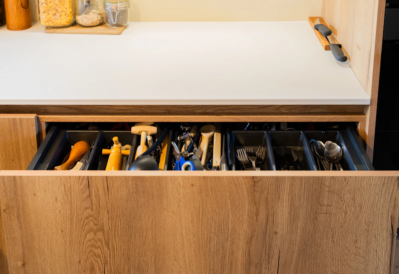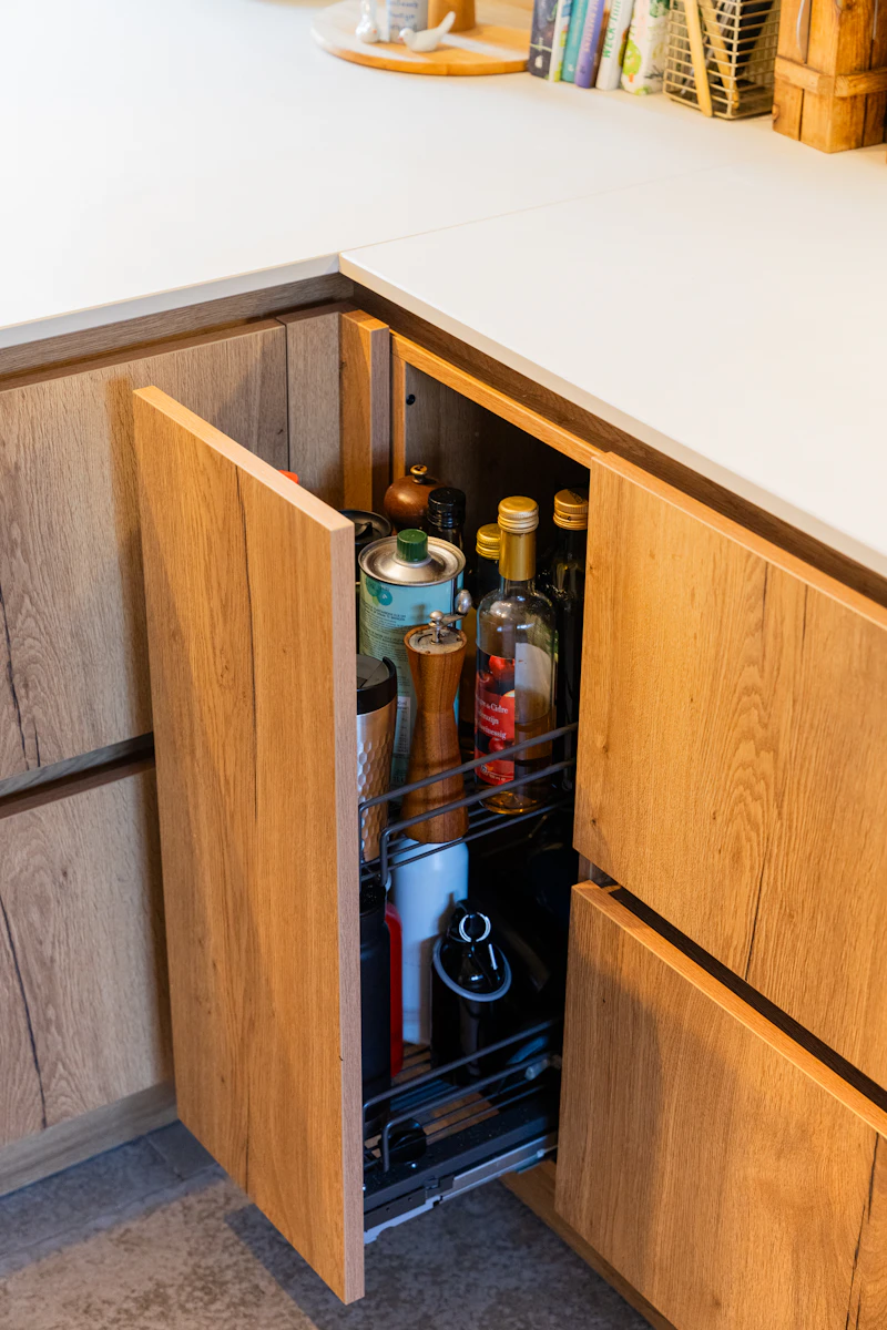 Koken doe je het liefst zo efficiënt mogelijk, dacht ook familie De Vries. Daarom bevat hun keuken een aantal praktische eigenschappen. Dankzij de handige kast van amper 15cm worden alle hoekjes en kantjes benut. Ook de apotheekkast en de zwevende exemplaren bieden volop opbergruimte.