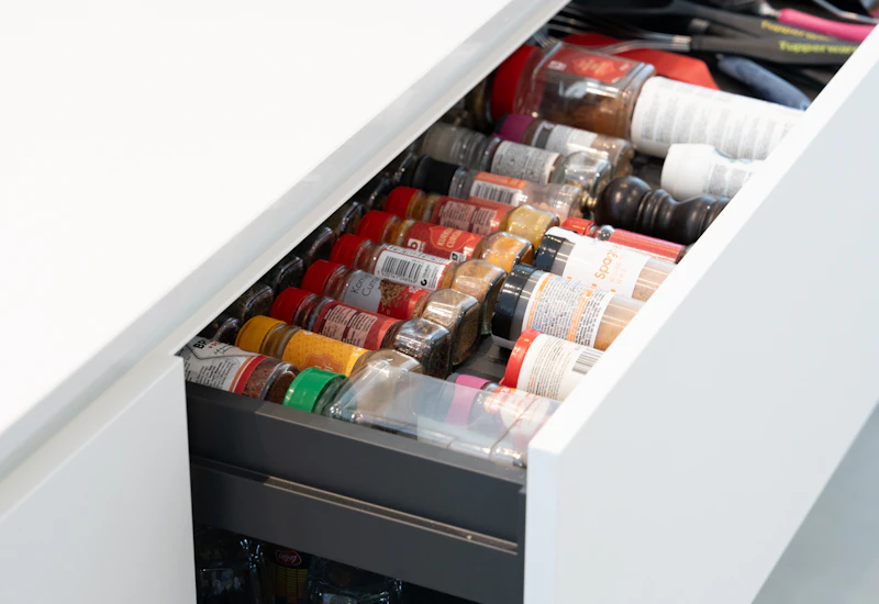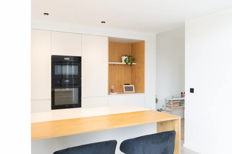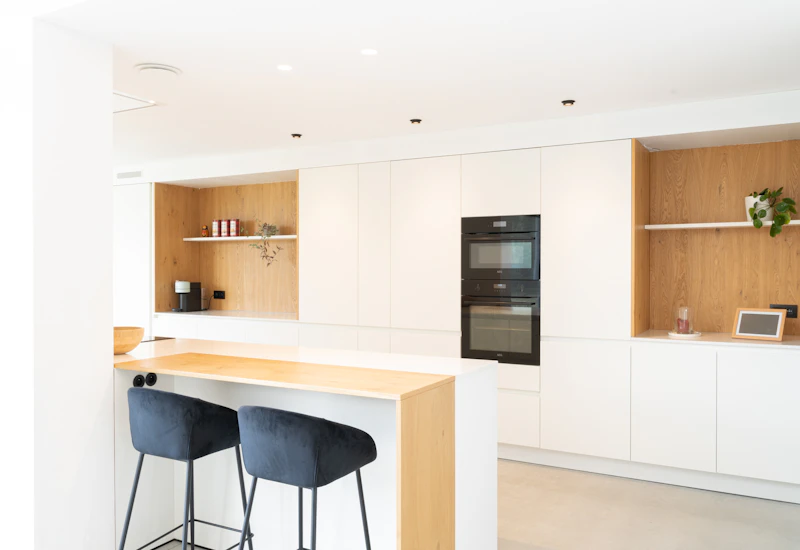 De dubbele open nissen zijn niet alleen gezellige koffiehoekjes, maar volgen ook helemaal de nieuwste trends in de keukensector. Het fineerhout voegt een mooi kleuraccent toe aan het strakke en witte ontwerp. Ook is het afzuigsysteem boven de kookplaat een innovatief snufje. De dampkap met hercirculatie is rechtstreeks in het plafond verwerkt, waardoor ze niet in de weg hangt tijdens het kokerellen.