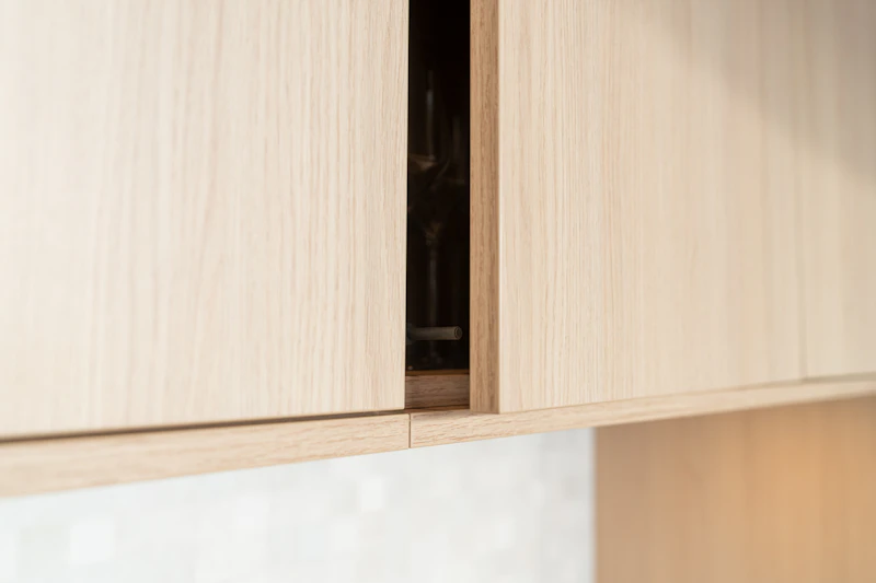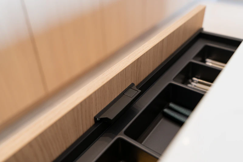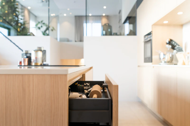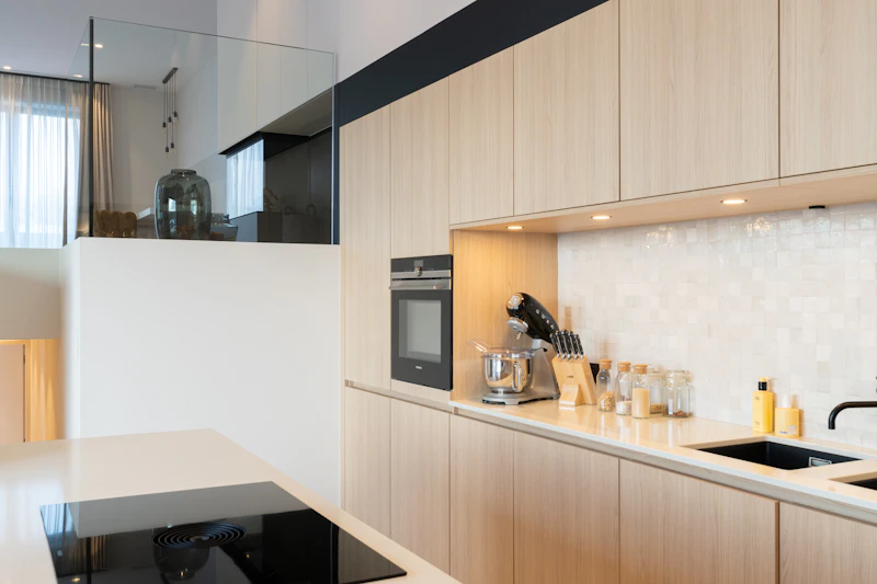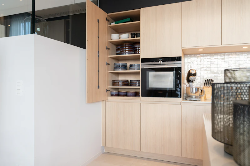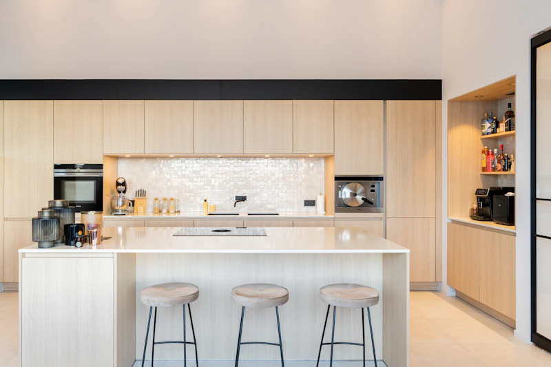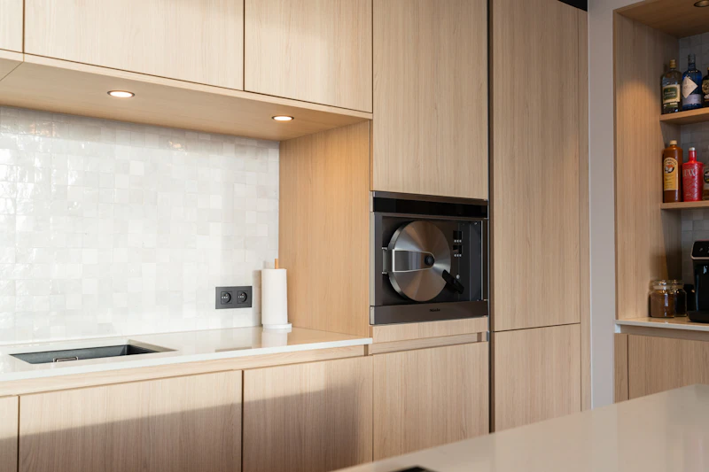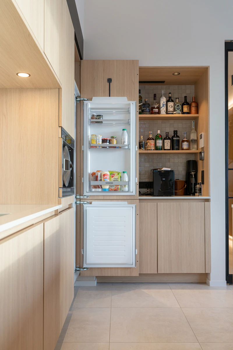 Om tegemoet te komen aan de stijlenmix combineerde we hout met een strak wit composiet keukenblad. Zwarte accenten met authentiek tegelwerk en de nieuwste technologieën die pasten bij de ruime ingewerkte wijnkasten. Opbergruimte en klasse in overvloed!